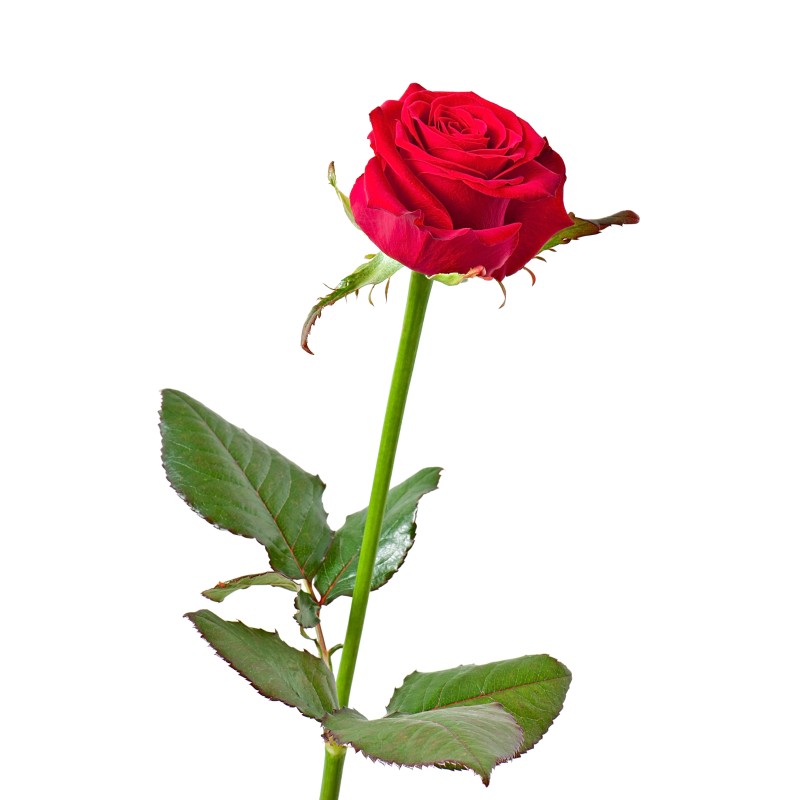 Rosa individual roja preparada para regalo con acompañamiento vegetal y flor silvestre de temporada.